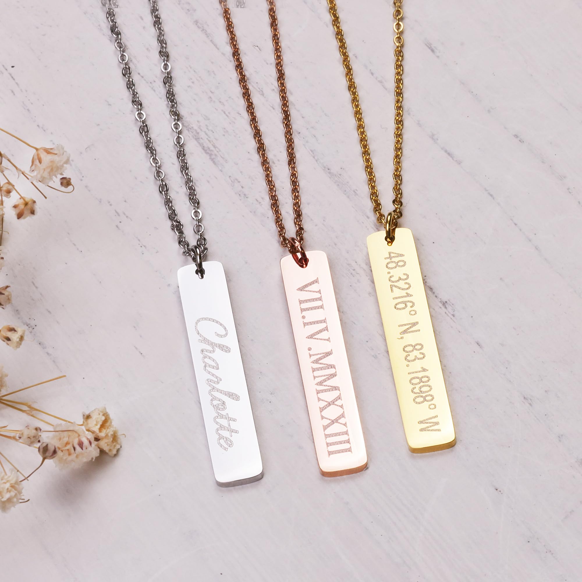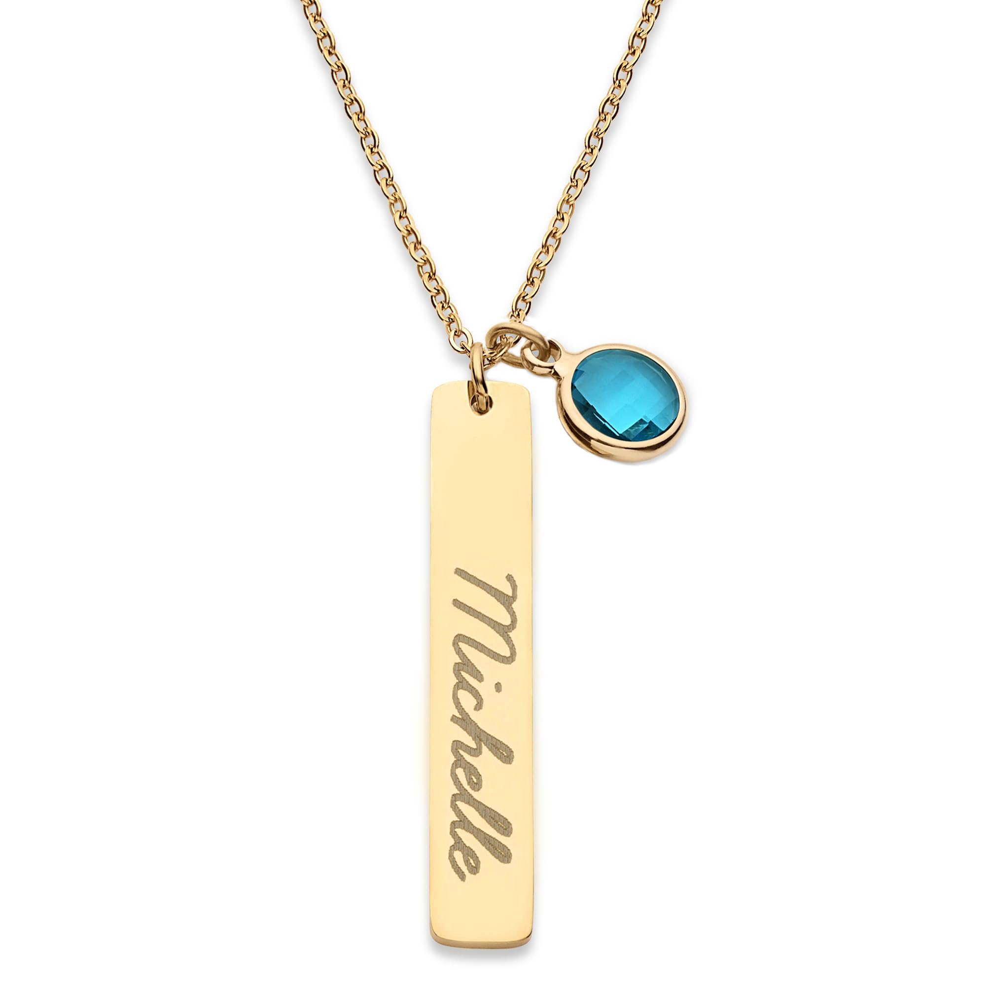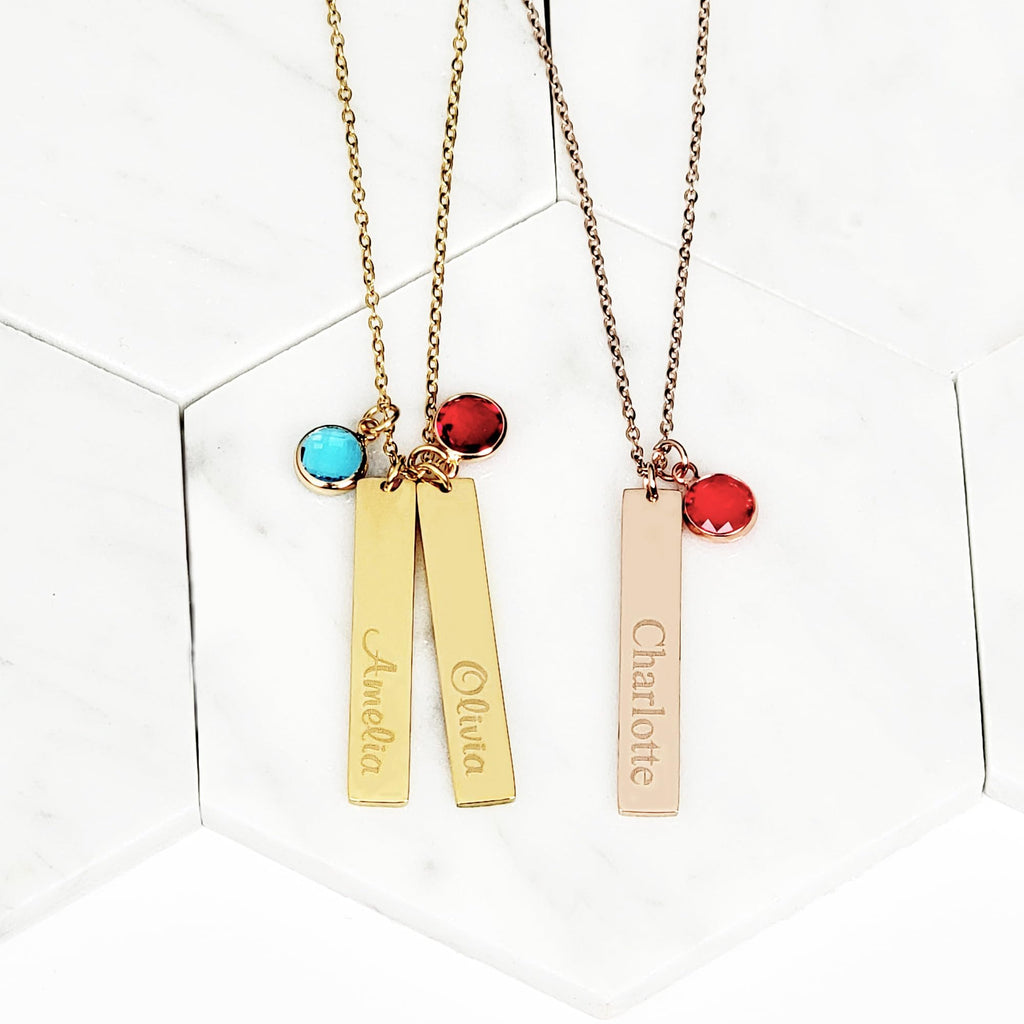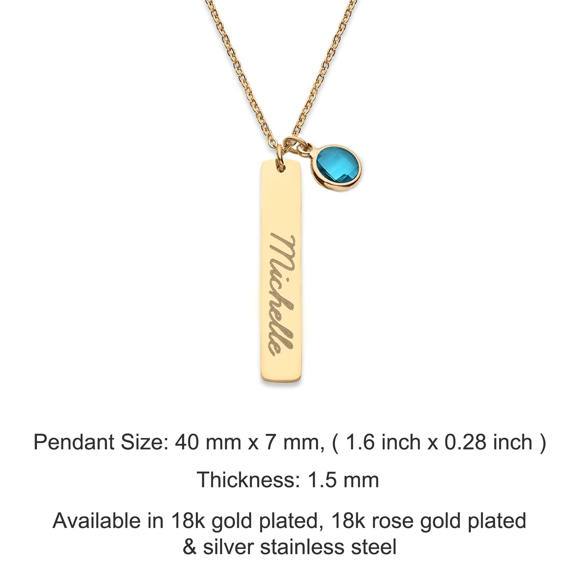 PERSONALIZED JUST FOR HER: Customize stunning and exquisite birthstones and pendants. [Birthstone Size]: 0.35 x 0.47 inch, 9 x 12 mm. [Pendant Size]: Bar - 40 mm x 7 mm ( 1.6 inch x 0.28 inch ) [Necklace Length]: 16"+2", 18"+2" & 20"+2" extender. [Metal Type & Color]: 18k yellow gold plated, 18k rose gold plated, Silver Color High Quality Surgical Grade Stainless Steel