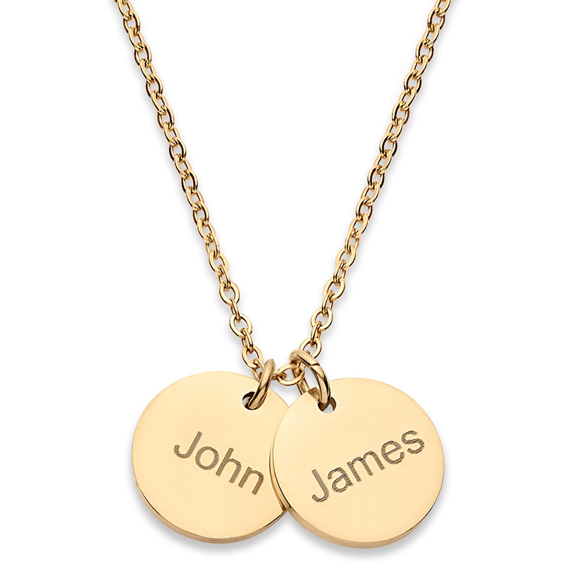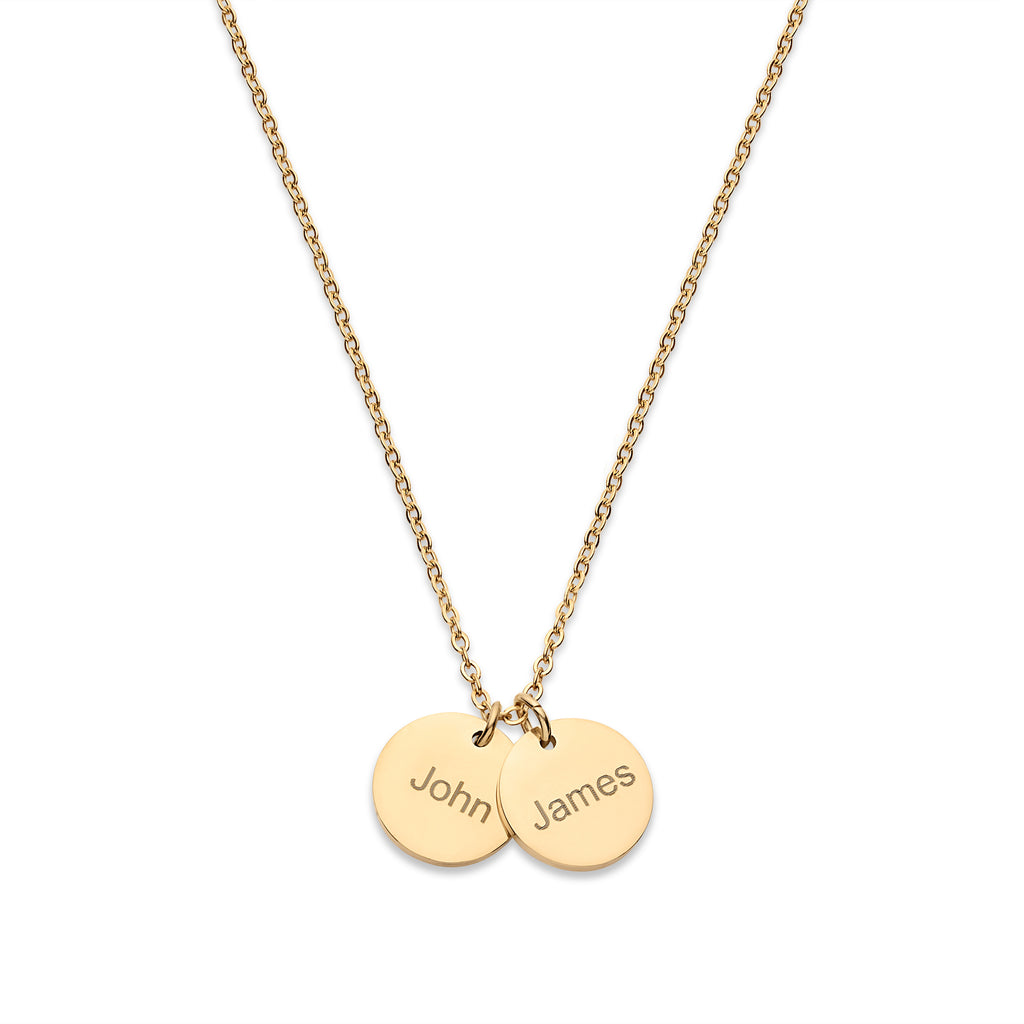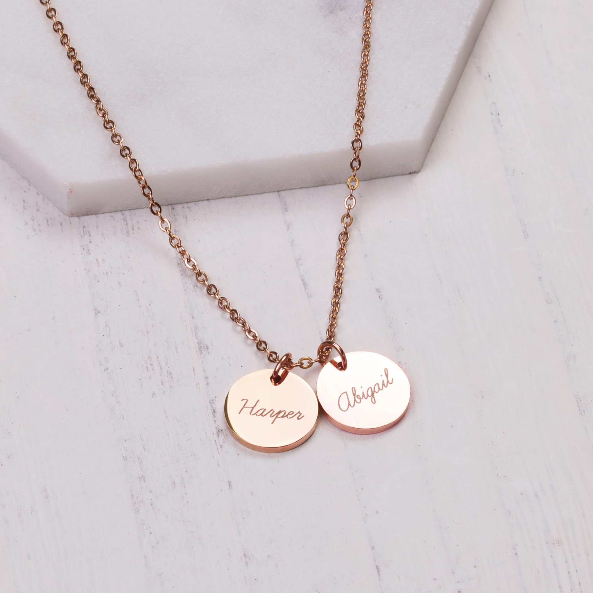 PERSONALIZED JUST FOR HER: Customize a stunning and exquisite pendant with names up to 5. [Pendant Size]: 1/2 inch (13 mm) [Necklace Length]: 16"+2", 18"+2" & 20"+2" extender. [Metal Type & Color]: 18k yellow gold plated, 18k rose gold plated, Silver Color High Quality Surgical Grade Stainless Steel