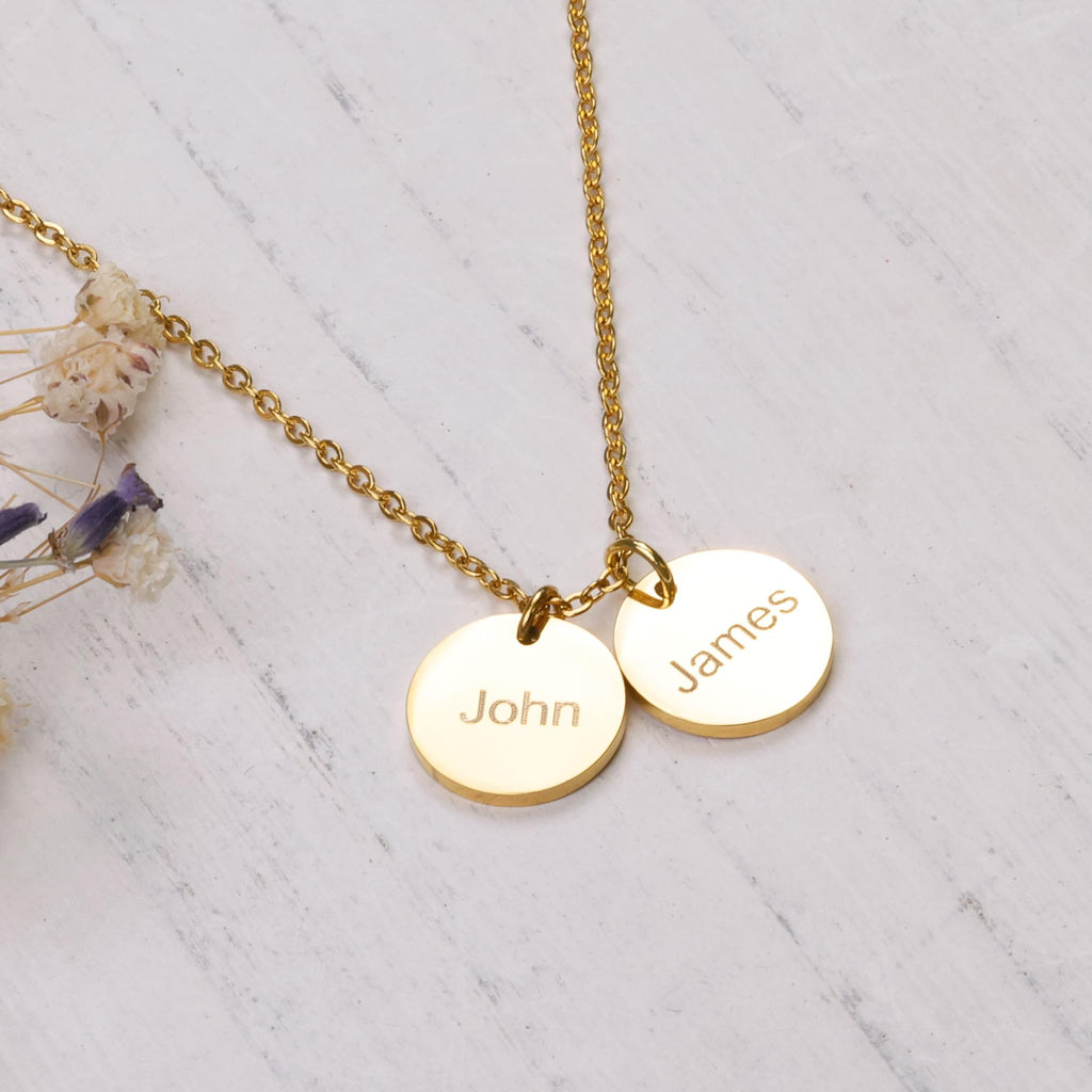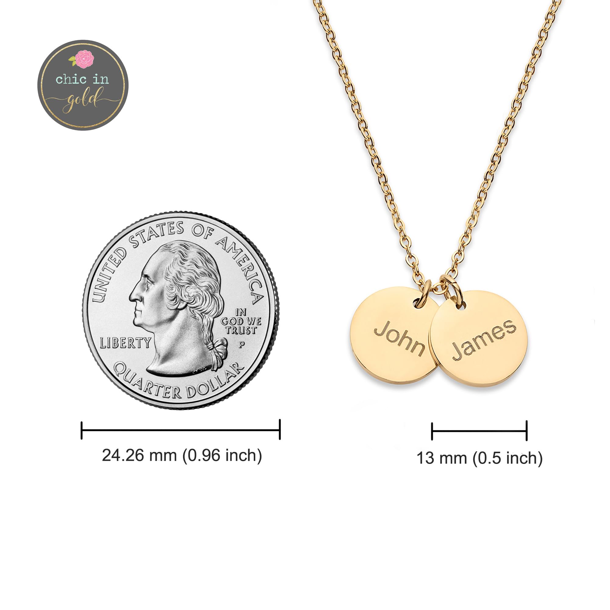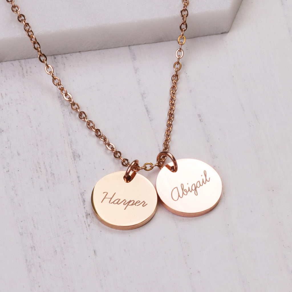 PERSONALIZED JUST FOR HER: Customize a stunning and exquisite pendant with names up to 5. [Pendant Size]: 1/2 inch (13 mm) [Necklace Length]: 16"+2", 18"+2" & 20"+2" extender. [Metal Type & Color]: 18k yellow gold plated, 18k rose gold plated, Silver Color High Quality Surgical Grade Stainless Steel