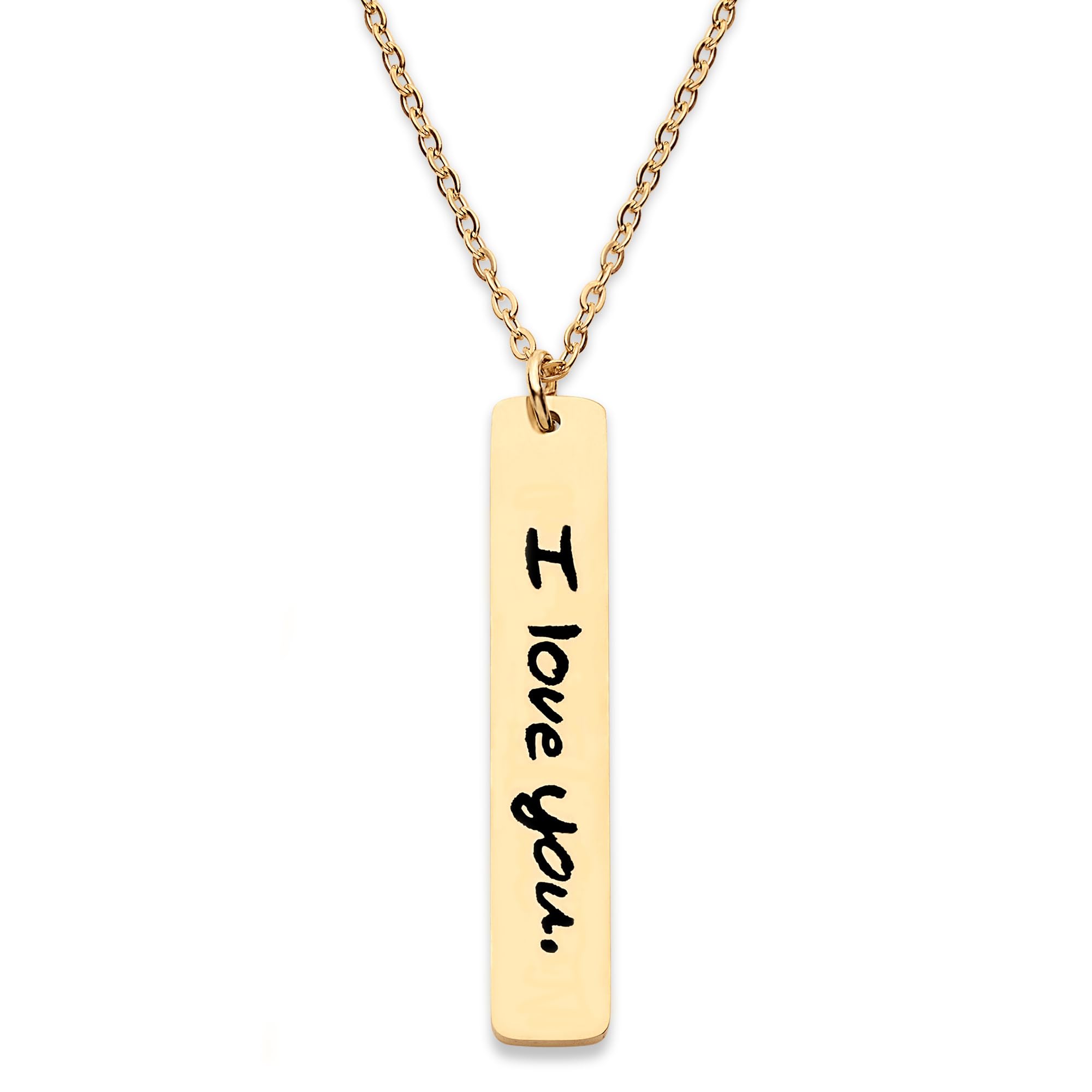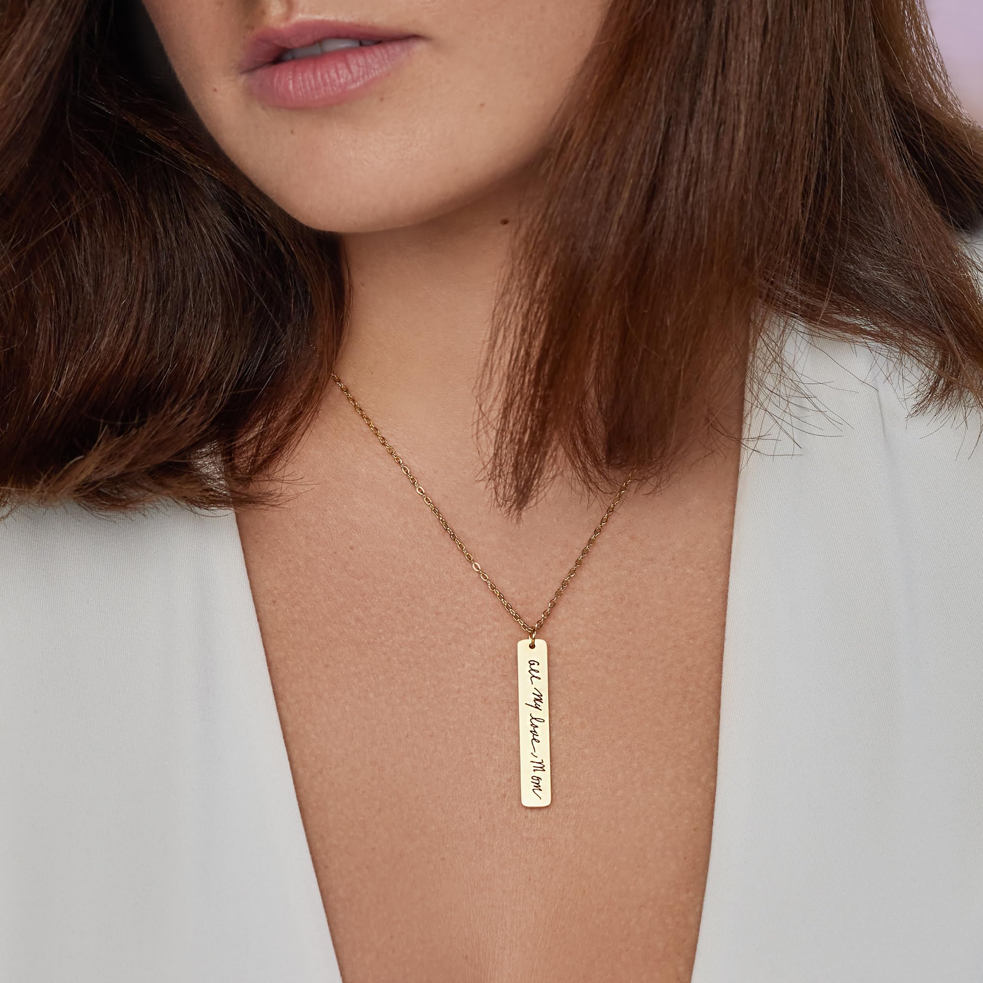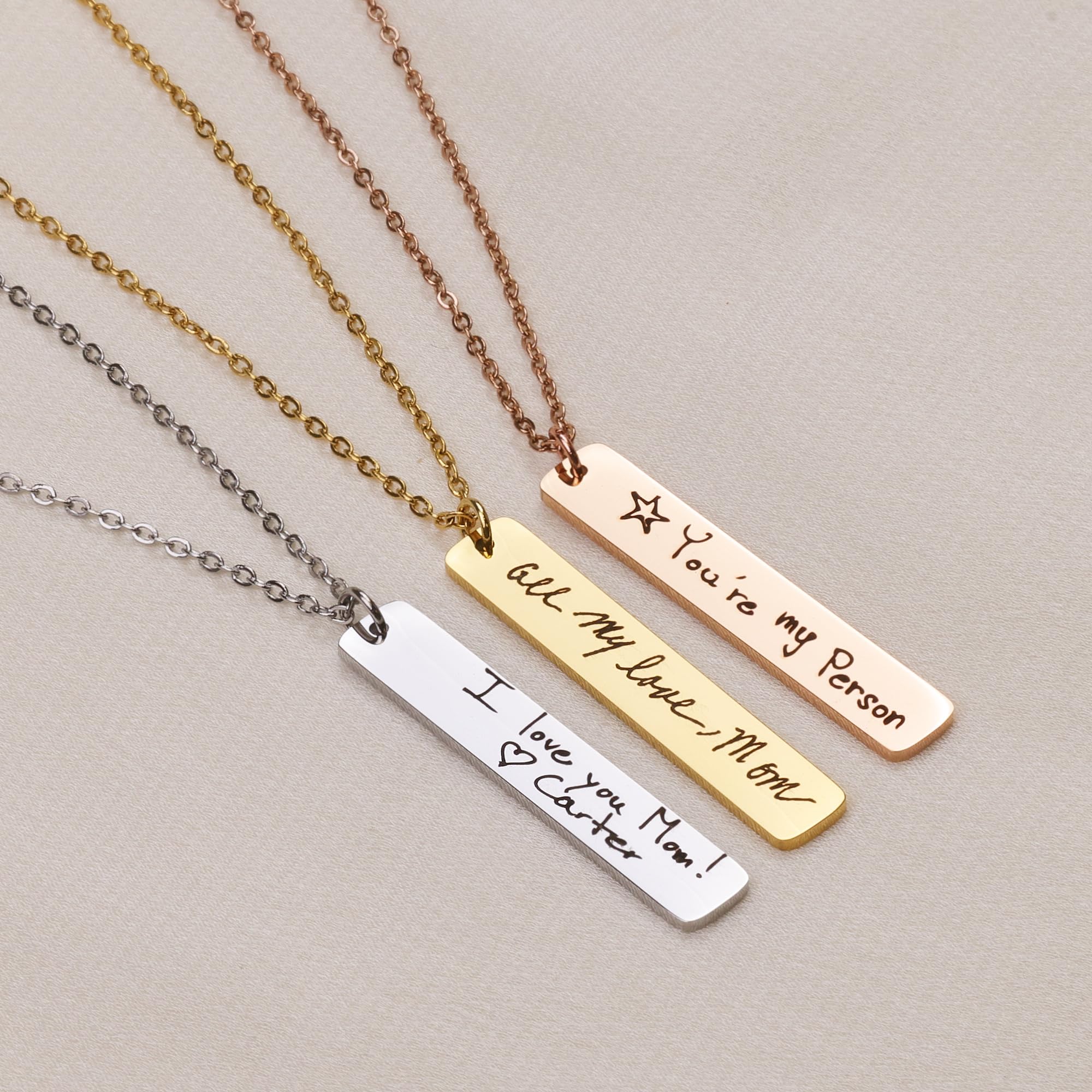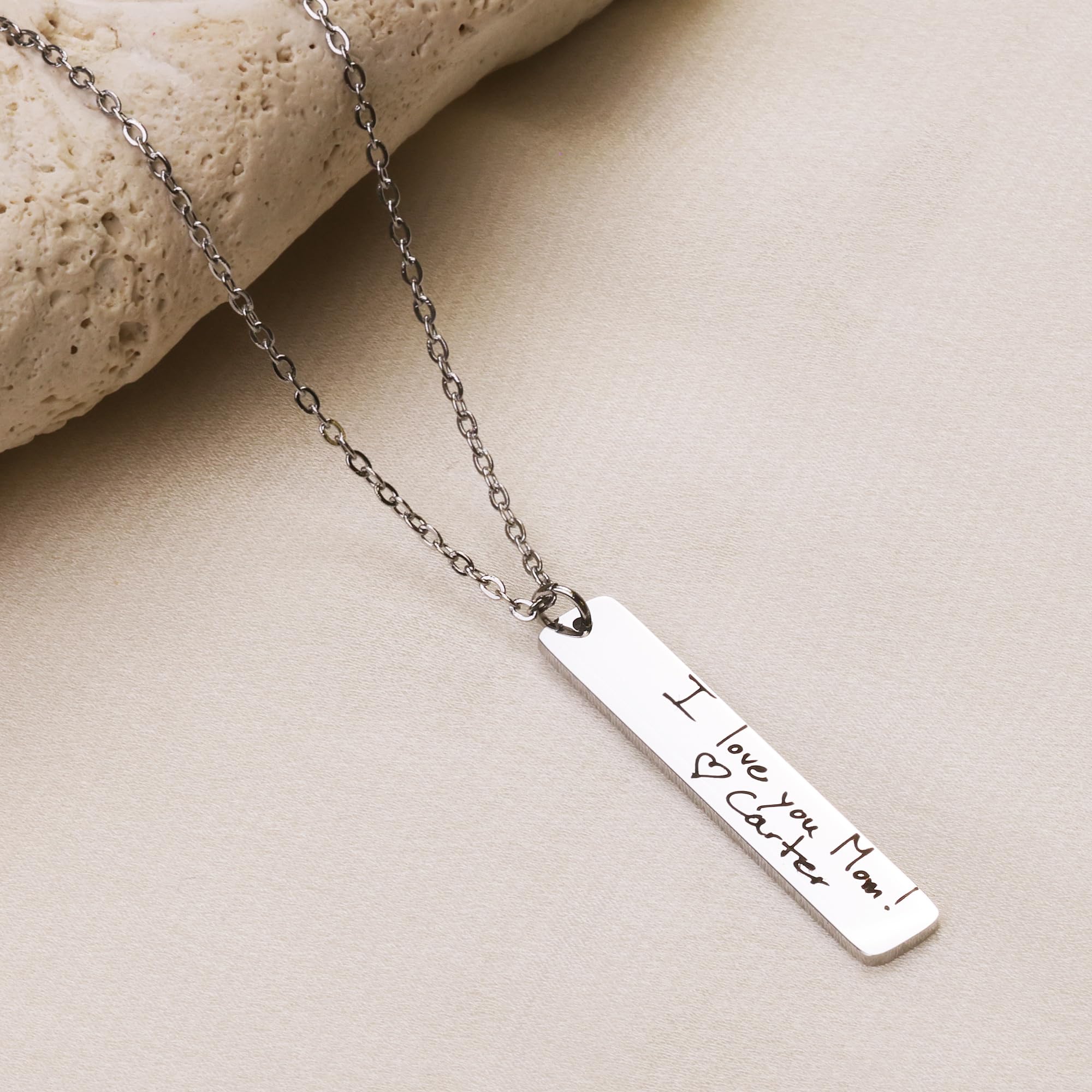 PERSONALIZED JUST FOR HER: Customize a stunning and exquisite rectangle bar pendant with Actual Handwriting. [Pendant Size]: Bar - 40 mm x 7 mm ( 1.6 inch x 0.28 inch ), [Necklace Length]: 16"+2", 18"+2" & 20"+2" extender. [Metal Type & Color]: 18k yellow gold plated, 18k rose gold plated, Silver Color High Quality Surgical Grade Stainless Steel