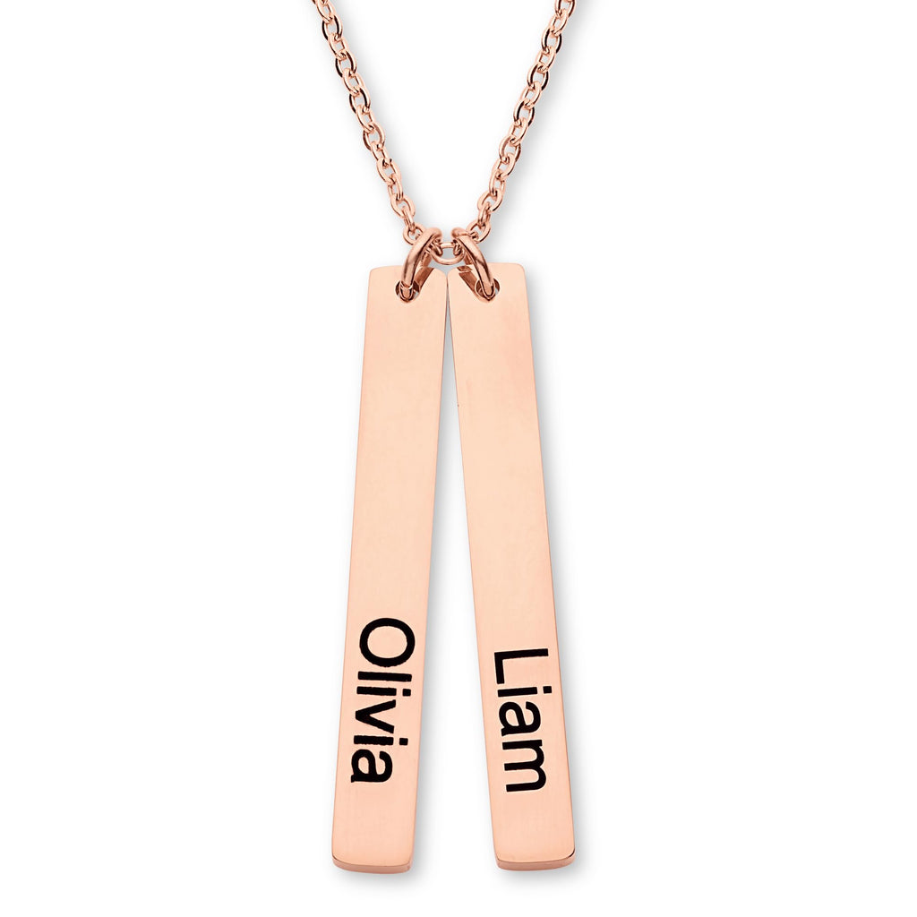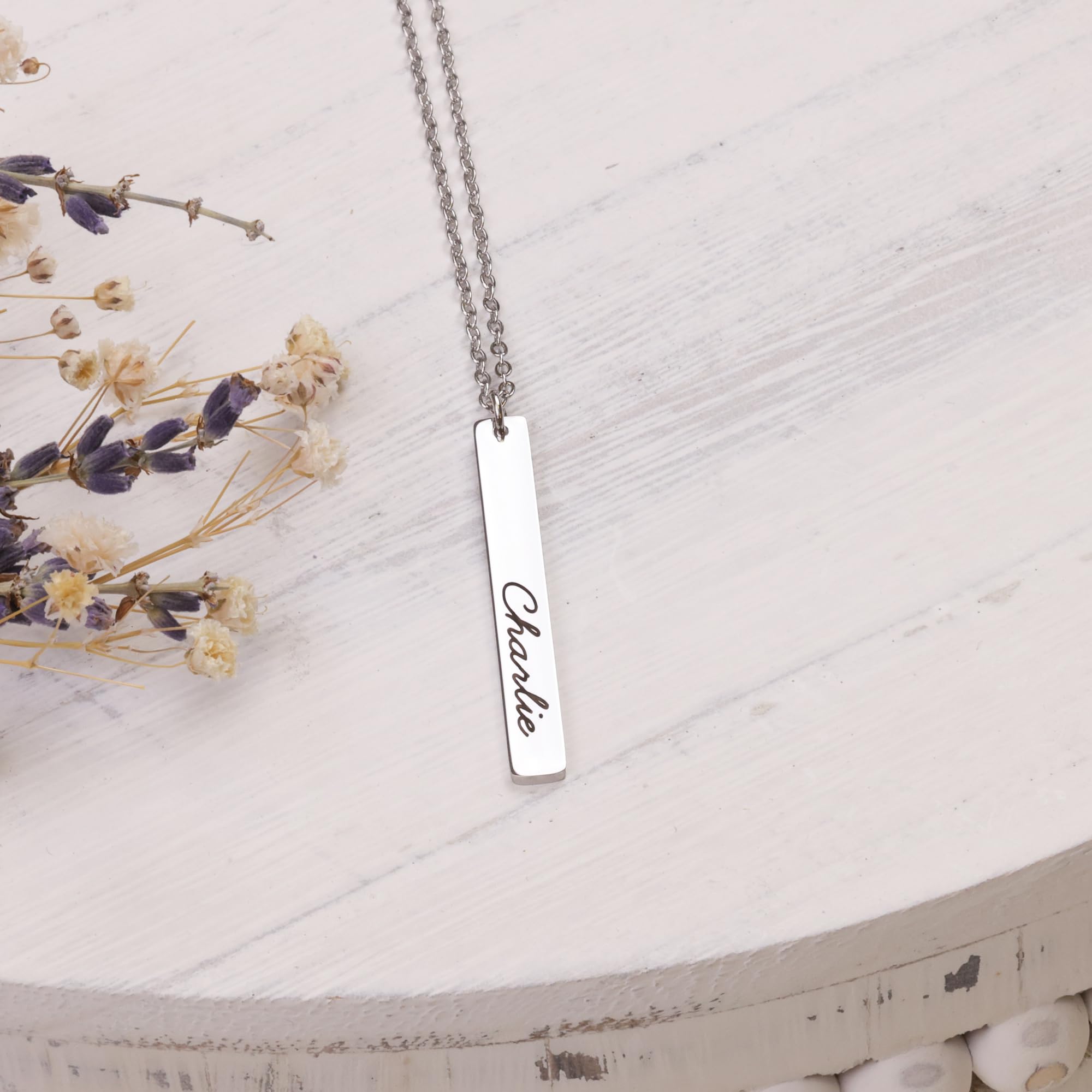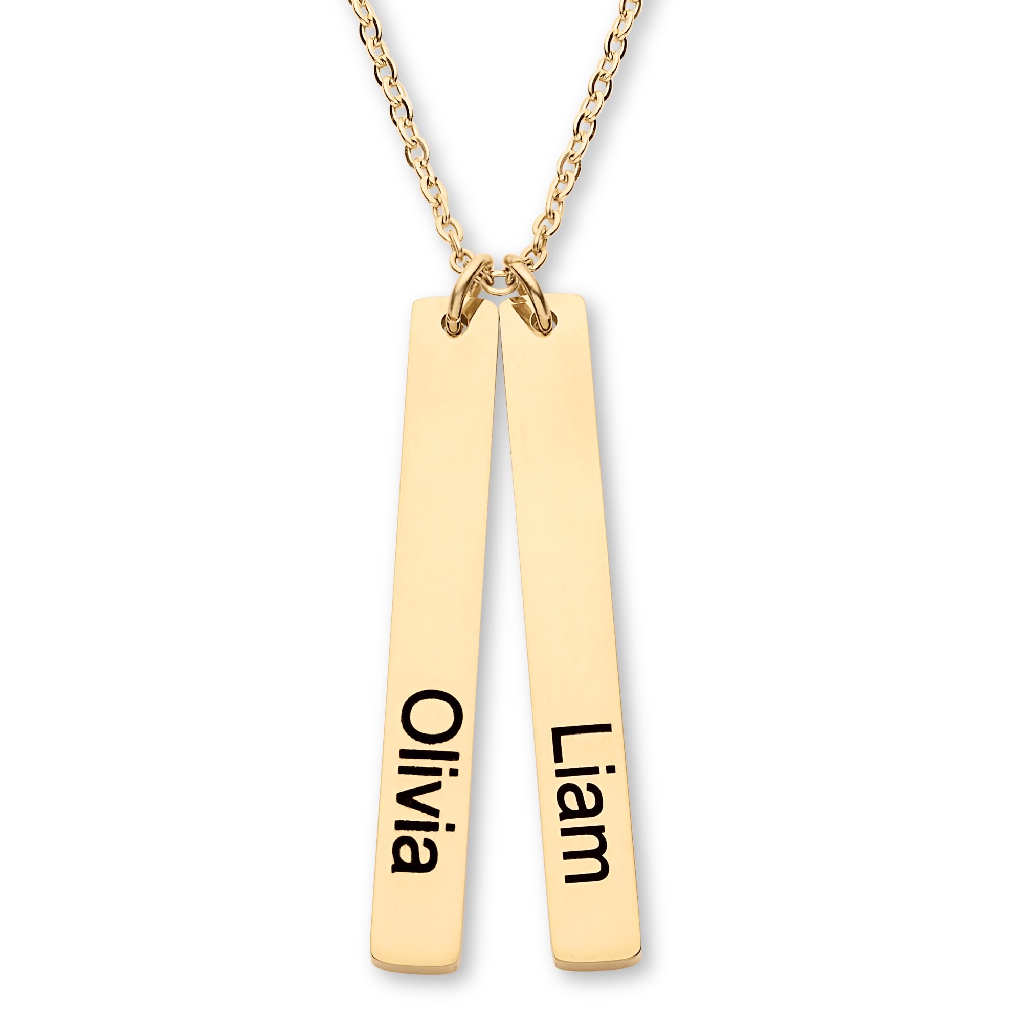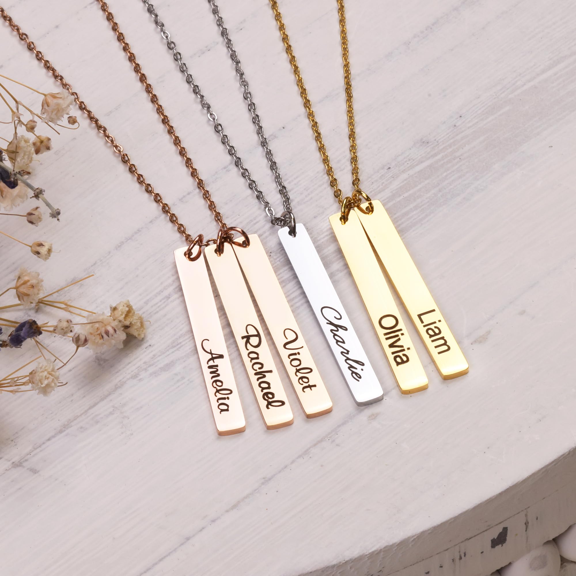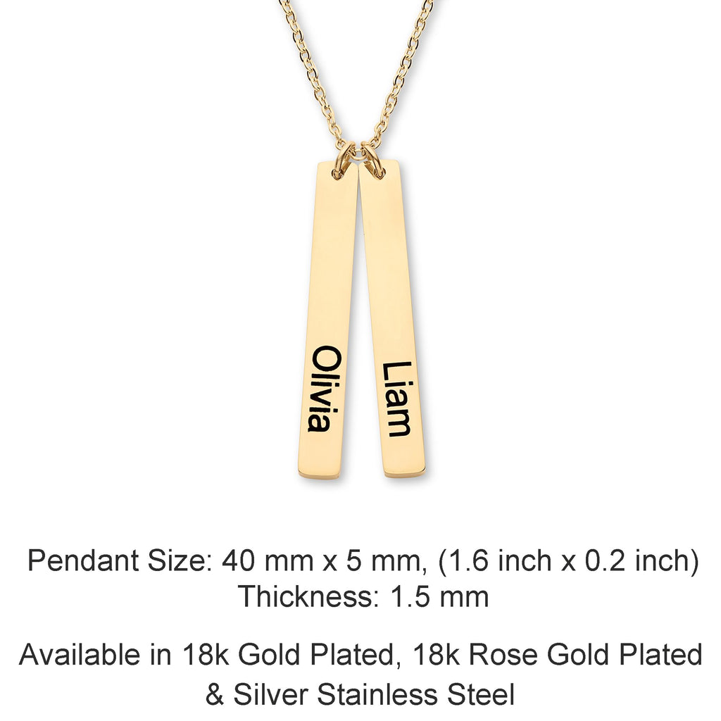 PERSONALIZED JUST FOR HER: Customize a stunning and exquisite rectangle bar pendants with names up to 4. [Pendant Size]: Bar - 40 mm x 5 mm ( 1.6 inch x 0.28 inch ), [Necklace Length]: 16"+2", 18"+2" & 20"+2" extender. [Metal Type & Color]: 18k yellow gold plated, 18k rose gold plated, Silver Color High Quality Surgical Grade Stainless Steel