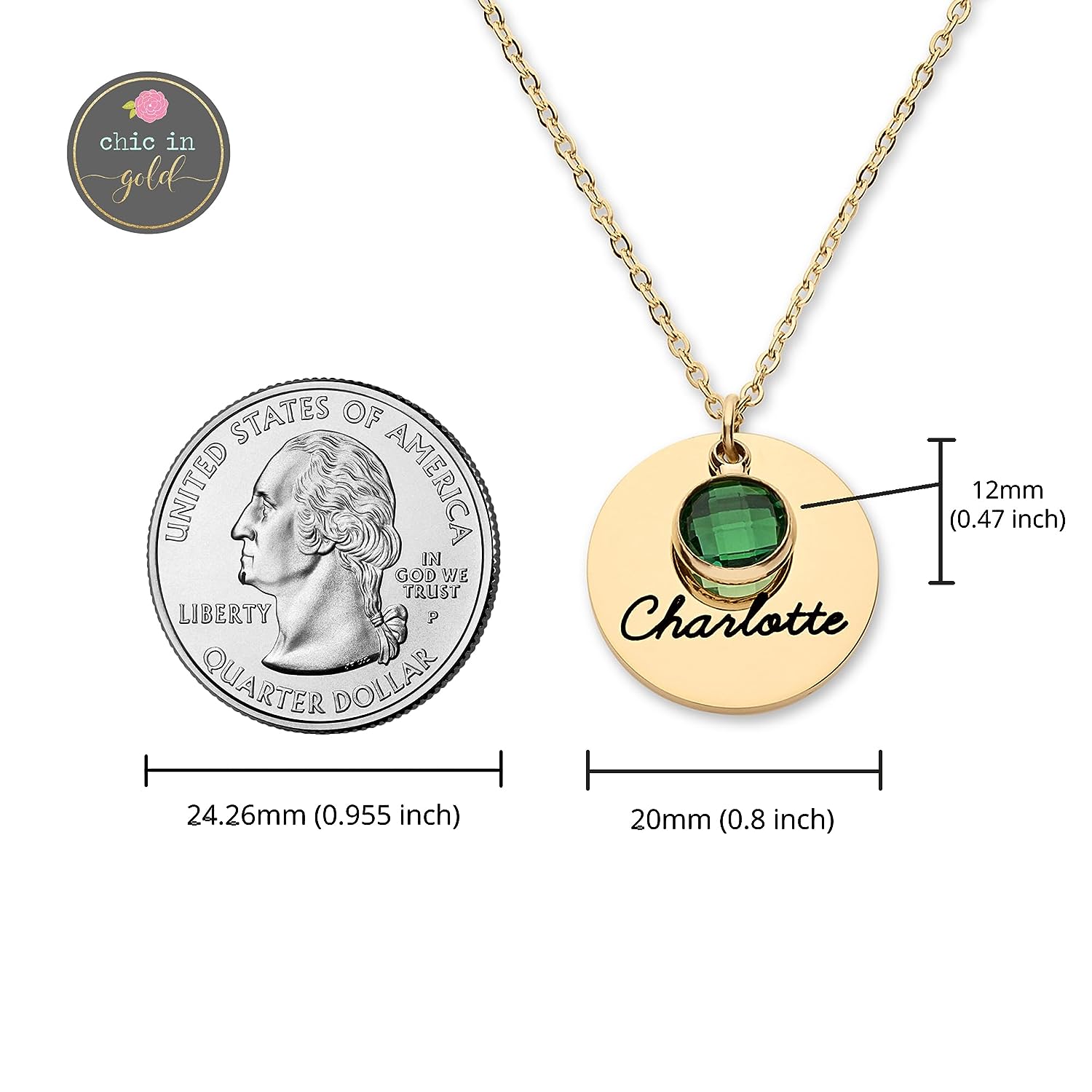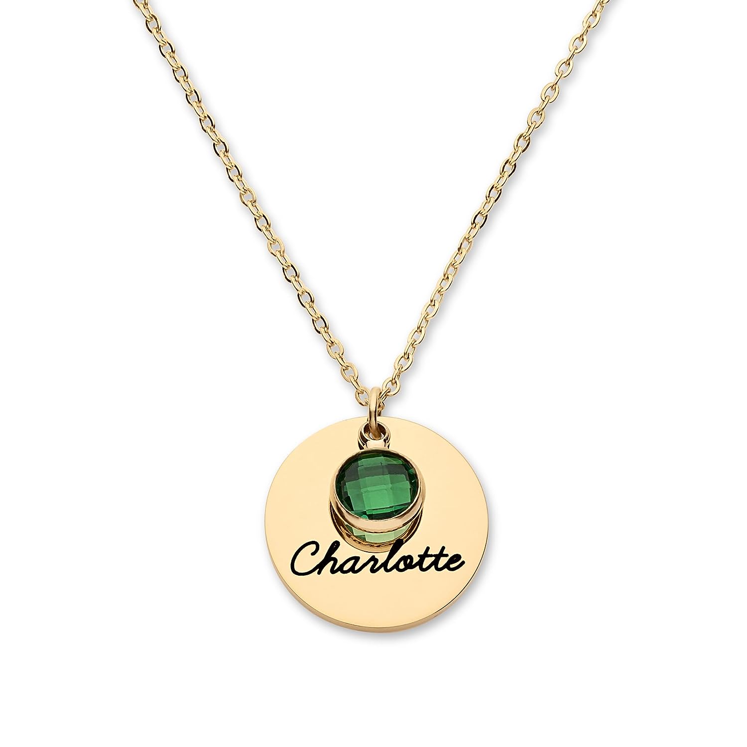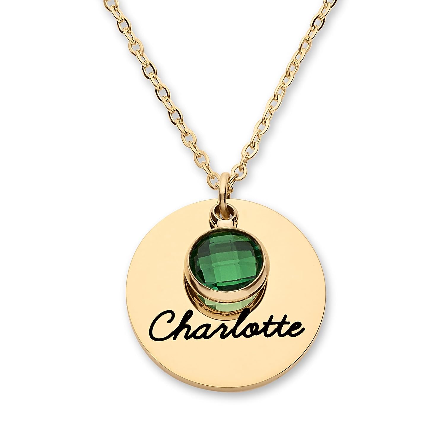 PERSONALIZED JUST FOR HER: Customize a stunning and exquisite birthstone and a name pendant up to 4. [Birthstone Size]: 0.27 x 0.35 inch (7 x 9 mm). [Pendant Size]: 0.8 inch (20 mm) [Necklace Length]: 16"+2", 18"+2" & 20"+2" extender. [Metal Type & Color]: 18k yellow gold plated, 18k rose gold plated, Silver Color High Quality Surgical Grade Stainless Steel